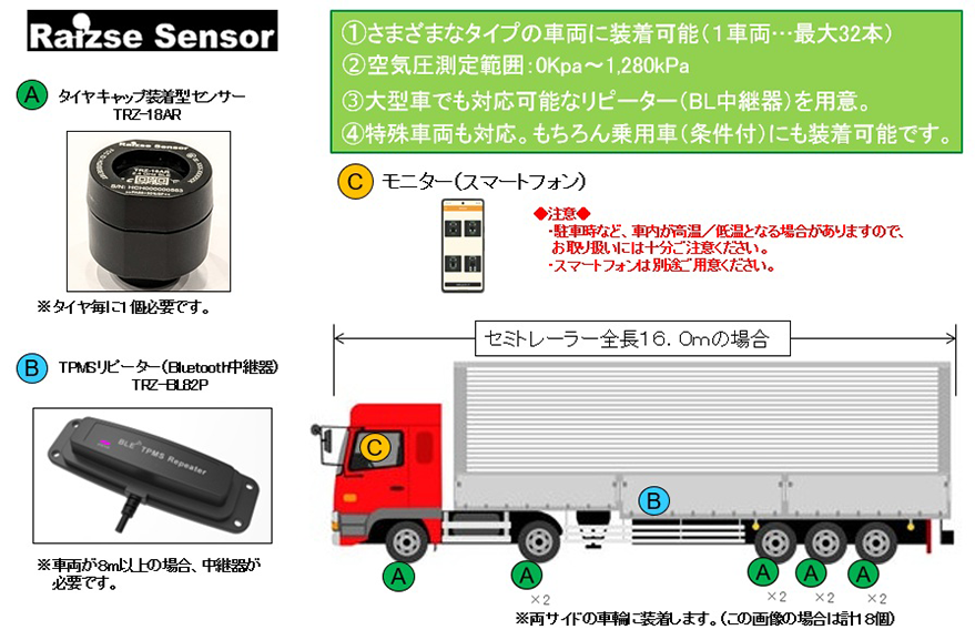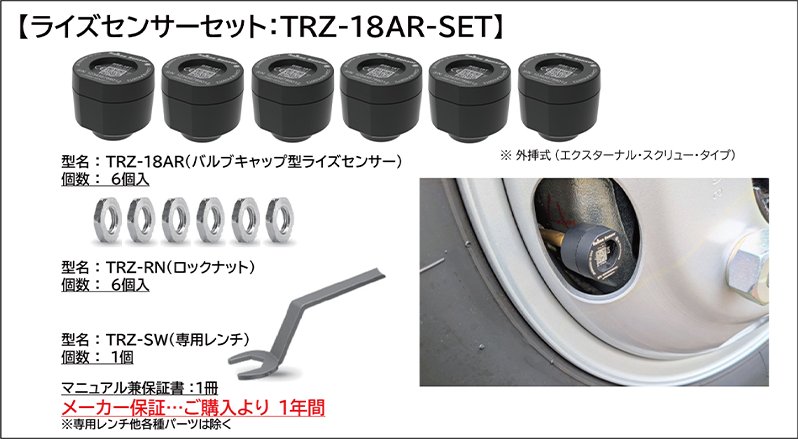 5)国内で販売されている外挿式センサー(バルブキャップ式センサー)の多くは乗用車用であり、トラックなどの商業用車両には空気 圧などの範囲が適応しておりません。また、国内でネット販売されている安価製品の多くは海外輸入品であり、使用や保証などに 不安があります。