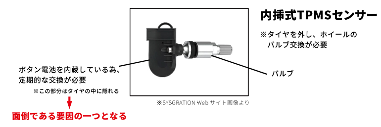 現状主流の内挿式センサーなどは、空気注入バルブを内挿式型センサーに付け替える為、タイヤを外して